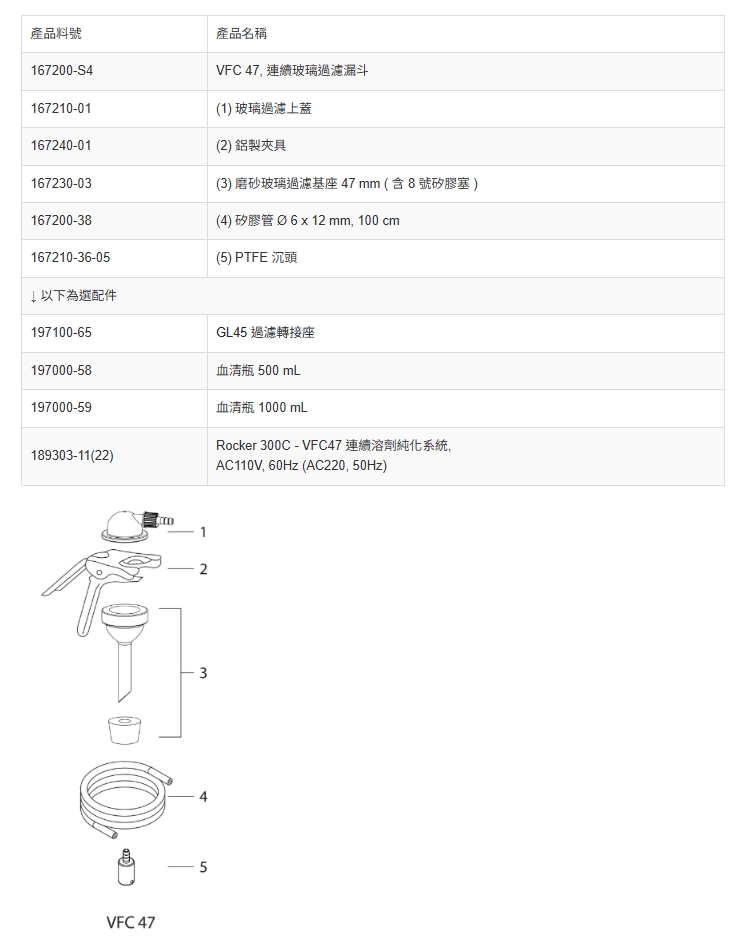 .整組有300ml漏斗杯,孔徑約40-60 Microns的玻璃濾片基座,鋁夾及適用1000ml過濾瓶(過濾瓶請另購)的矽膠塞